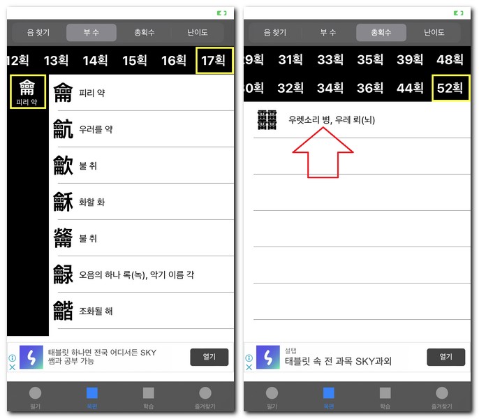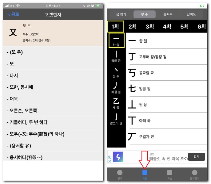 그리고 메뉴 하단에 옥편이 있는데 옥편 검색도 가능하다. 음찾기 및 부수, 총획수, 난이도별로 구성되어 있다. 1획의 종류와 한문(한자) 리스트까지 자세히 확인할 수 있다.