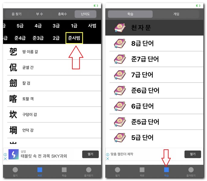 학습의 종류에는 학습과, 게임 카테고리가 있는데 우리가 잘 알고 있는 천자문이나 8급 단어, 준7급, 7급, 준6급, 6급, 준5급, 5급 등 급수별로 한자를 학습할 수 있게 되어 있다.