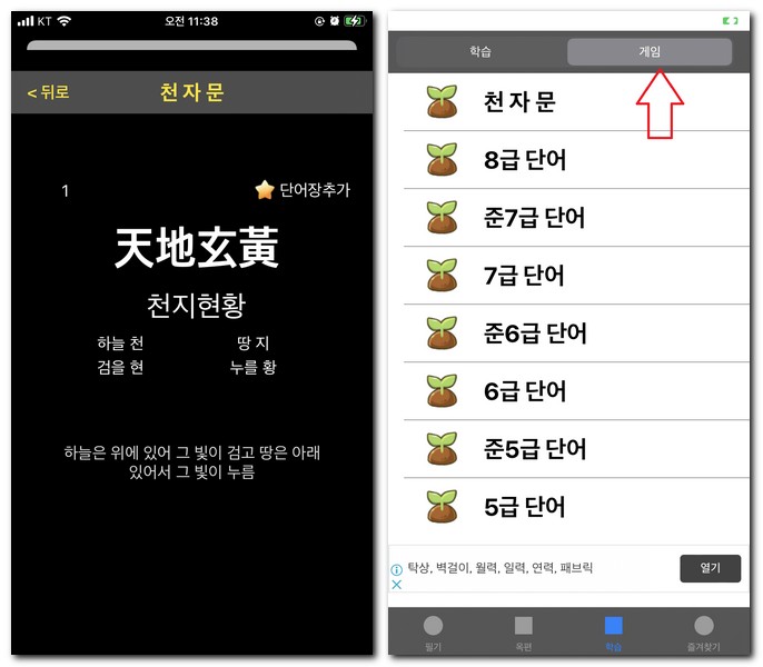 게임을 선택해보게 되면 보다 재밌게 한자 공부를 할 수 있도록 도와준다.
