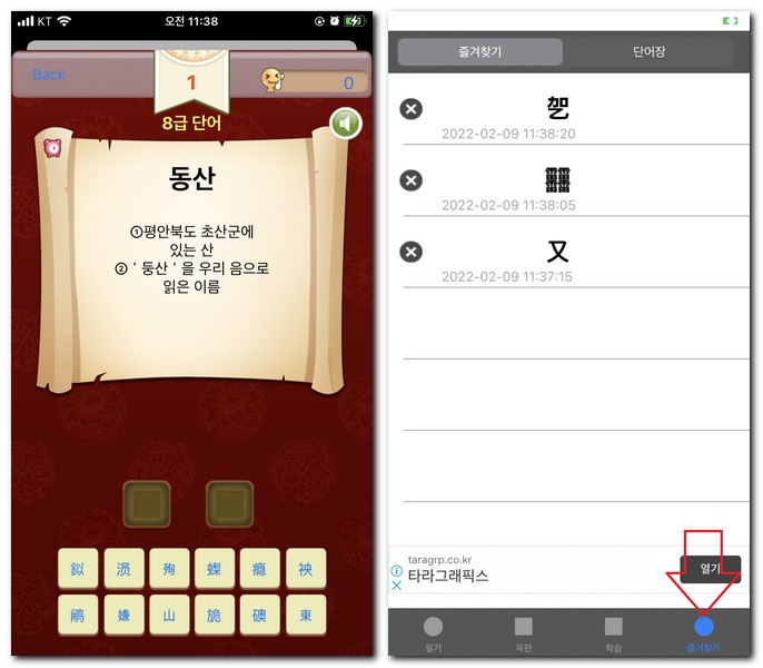 이밖에도 즐겨찾기 메뉴에서는 현재까지 찾은 한자에 대해서 자세히 확인할 수있게 된다.