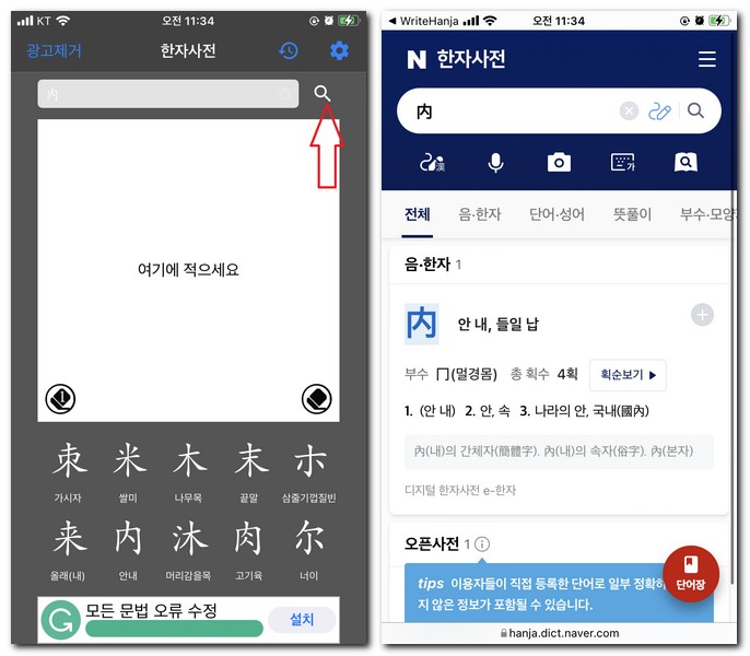 상단 검색하기 부분에 한자가 자동 입력되게 되는데 검색 버튼을 터치해보게 되면 네이버 사전으로 한자 찾기가 된다.