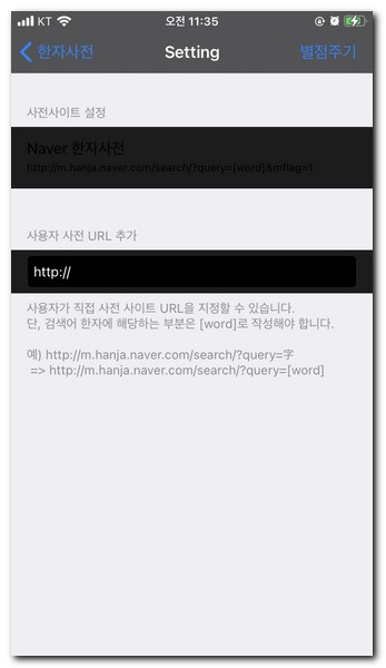 단 사용자 사전 url 추가시 url 끝부분 검색어 한자에 해당하는 곳은 [word]로 입력해야되는 점만 주의하면 된다.