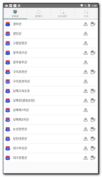 전국고속도로 실시간CCTV 교통상황 어플을 실행하게 되면 처음 전국 고속도로명이 나타난다. 경부고속도로, 경인고속도로, 광주대구 고속도로 등 본인이 이용하는 고속도로 명을 터치한다.