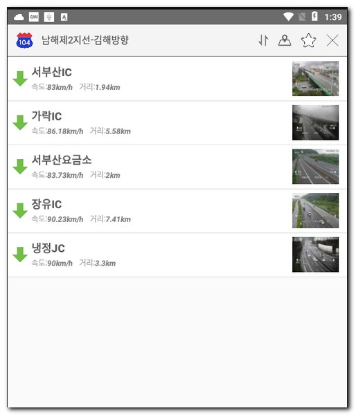 서부산IC와 가락IC, 서부산요금소, 장유IC, 냉정JC의 교통상황을 실시간 CCTV를 통해서 확인할 수 있다. 각 분기점 별로 평균속도와 함께 거리도 확인할 수 있도록 되어 있다.