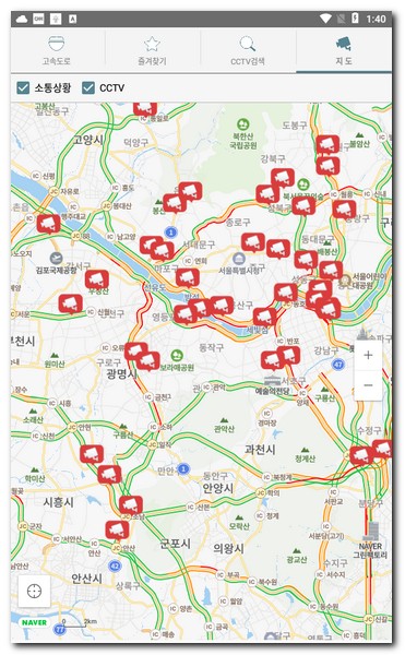cctv 뿐만 아니라 고속도로 소통상황도 확인 가능하며 네이버 지도를 이용한 것이기 때문에 매우 정확도가 높다.