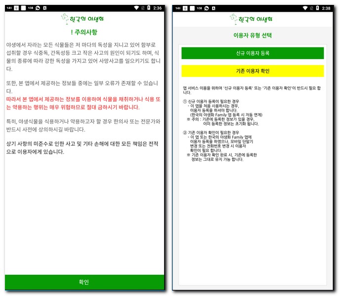 한국의 야상화 앱을 정상적으로 이용하기 위해서는 신규 이용자 등록을 진행해야된다. 기존 사용자가 있다면 기존 사용자 확인을 통해서 확인하면 된다.