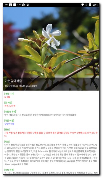 계화시기, 꽃 색깔, 이름 유래, 특징 등 세부적인 식물에 대한 정보를 확인할 수 있으며 식물의 사진도 함께 담겨 있어 매우 찾기 쉽게 되어 있다.