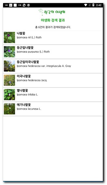 나팔꽃으로 검색했더니 총 6가지의 나팔꽃을 찾을 수 있었다.