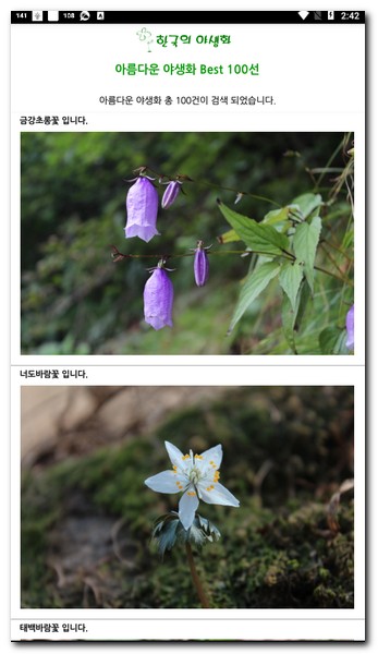 아름 다운 야생화 베스트도 함께 제공되고 있는데, 이용자들이 직업 올린 야생화 사진을 볼 수 있으며 사진을 터치하면 자세히 보기 할 수 있게 되어 있다.