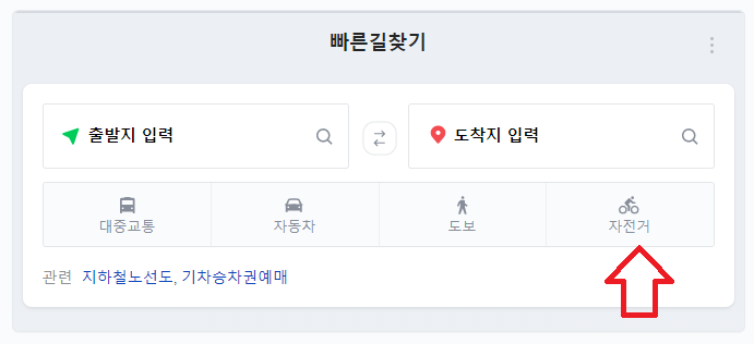 네이버에 접속해서 빠른길찾기를 이용해서 출발지 입력과, 도착지 입력 그리고 자전거로 검색을 진행한다.