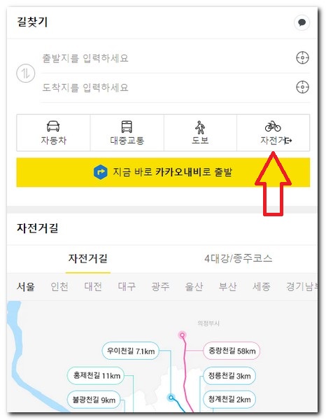다음 지도 길찾기 서비스에서는 자전거 도로를 검색할 수 있다.