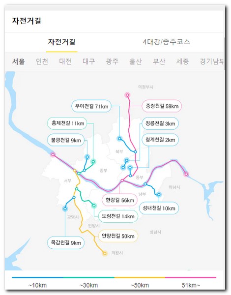 서울의 우이천길, 중랑천길, 홍제천길, 불광천길, 칭계천길, 한강길, 도림천길, 성내천길, 안양천길, 목감천길 등 각 지역별 대표적인 자전거 도로를 확인할 수 있다.