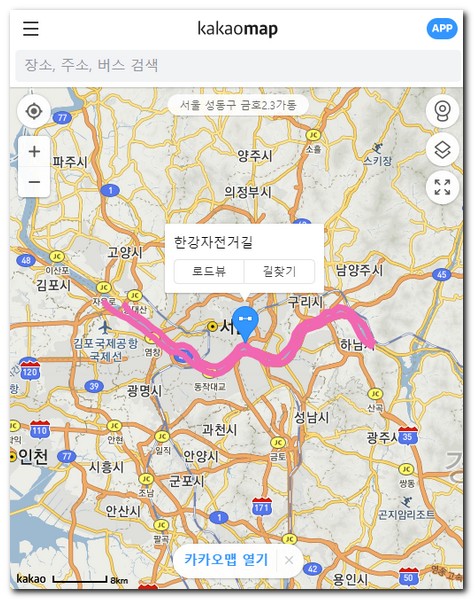 자전거 길을 선택하게 되면 카카오맵을 통해서 앱 설치 없이 지도 확인이 가능하다.