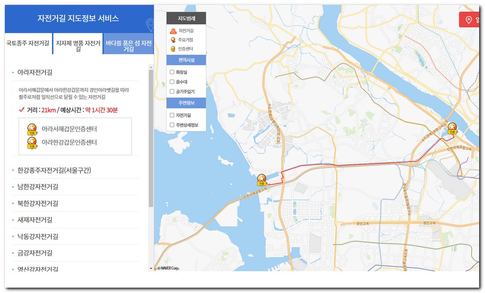 그럼 전국 자전거길 지도정보 서비스를 통해 자세히 자전거 도로를 확인할 수 있다.
