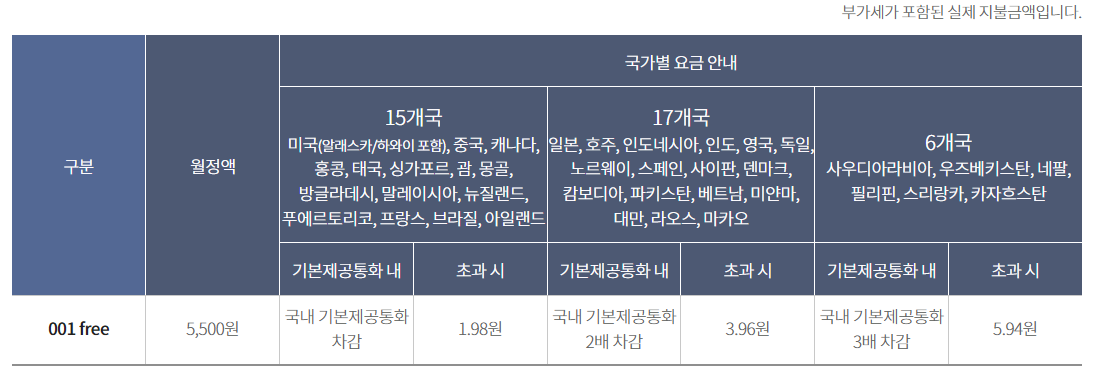 올레KT에서는 001 Free와 알짜요금제에 가입하게 되면 국제전화에 대한 혜택을 볼 수 있게 된다. 기존 국내전화에만 허용되던 통화량에 국제전화도 포함시켜주게 된다. 001음성통화를 통해서 해외에 전화 연결이 되는 것이다. 사진을 참고해서 국가별 요금 안내를 자세히 확인하기 바란다.