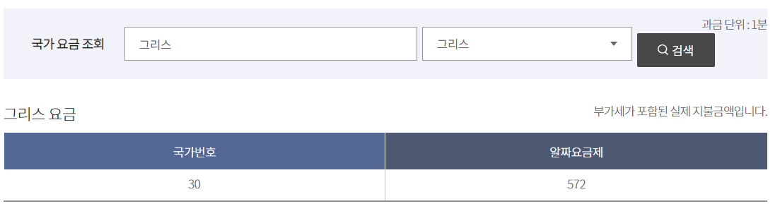 알짜요금제 페이지에서 해당 국가를 선택하게 되면 1분당 과금되는 요금을 확인할 수 있다.