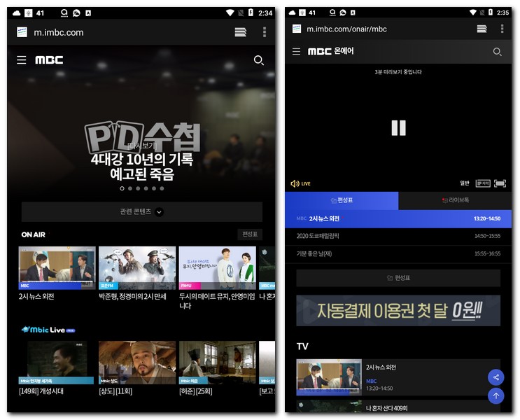 MBC온에어 서비스에 접속해서 현재 on air 서비스가 제공되고 있는 채널을 선택한다.