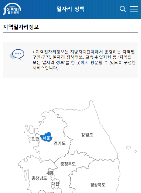 지역일자리정보는 지방자치단체에서 운영하는 지역별 구익,구직, 일자리 정책정보와 교육과 취업지원 등 지역의 모든 일자리 정보를 한 곳에서 제공되고 있다.