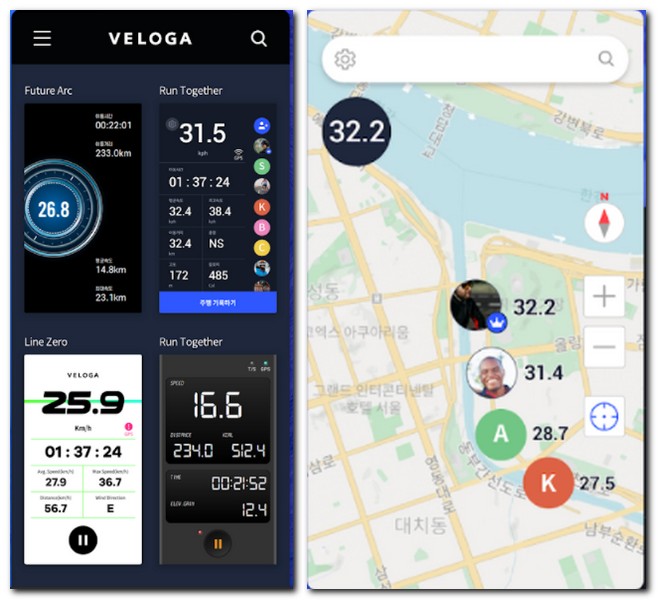 실시간으로 현재 속도를 확인할 수 있는 자전거 속도계와 다양한 지도 기능 자동 일시정지, 여러가지 데이터를 저장할 수 있도록 기록을 저장할 수도 있다.