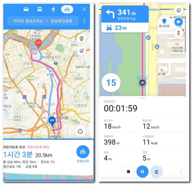 자동차 내비게이션으로도 사용이 가능하면서 자전거 타는 사람들에게도 함께 활용하면 좋은 자전거 전용 기능이 추가된 카카오맵이다.