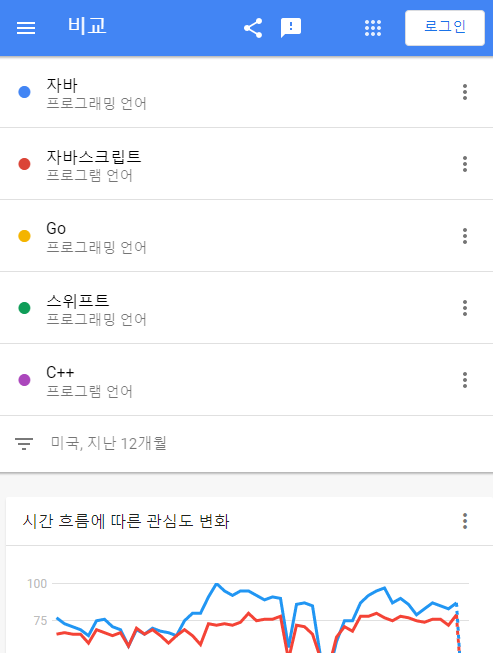 Google Trends 사이트는 구글에서 제공해주는 전세계 언어별 사용 빈도수와 얼마나 유행을 타고 있는 언어인지 비교분석해주는 사이트다. 각 나라별, 사용되고 있는 언어도 확인할 수 있다.