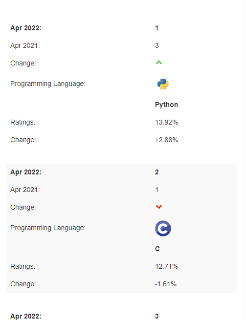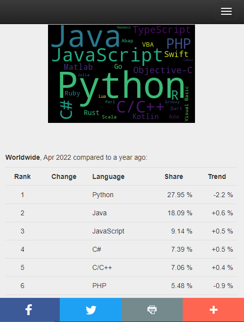 PYPL라는 사이트에서는 프로그래밍 언어를 얼마나 많이 공유되었고, 트렌드에 맞춰서 사용되고 있는지 분석해서 년도별로 순위를 알려주는 사이트다. 언어별 순위상승비율도 함께 확인할 수 있다.