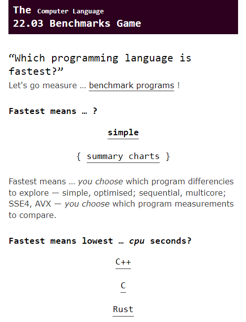 The Computer Language Benchmarks Game 사이트에서는 게임프로그래밍을 제작할때 어떤 언어가 순간반응속도와 얼마나 빠른 연산처리를 할 수 있는지 언어별 성능을 수치로써 자세히 설명한 사이트다.