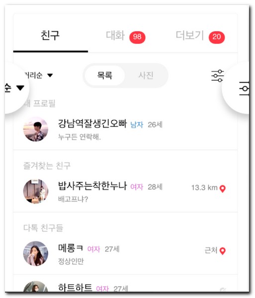 가볍게 친구를 만들어서 대화할 수 있도록 만들어진 어플이다. 주변에 여자친구, 남자친구가 있는 친구들이 부러울때 나는 왜 이성친구가 없을까 괴로워하지 말고 적극적으로 나서서 도전해보면 된다.