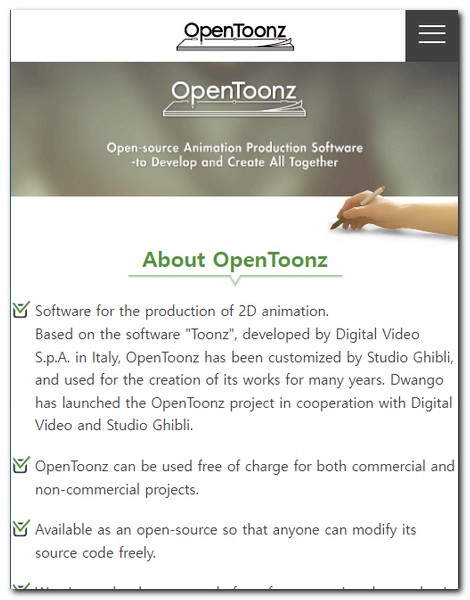 OPEN TOONZ(오픈툰츠)에서는 2D 애니메이션 프로그램을 무료로 다운로드 받아 사용할 수 있다. 2D 애니메이션을 전문적으로 제작할 수 있으며 그림스타일 변경이나 라이트효과, 물결 모양 왜곡 효과 등 다양한 기능들을 사용할 수 있다.