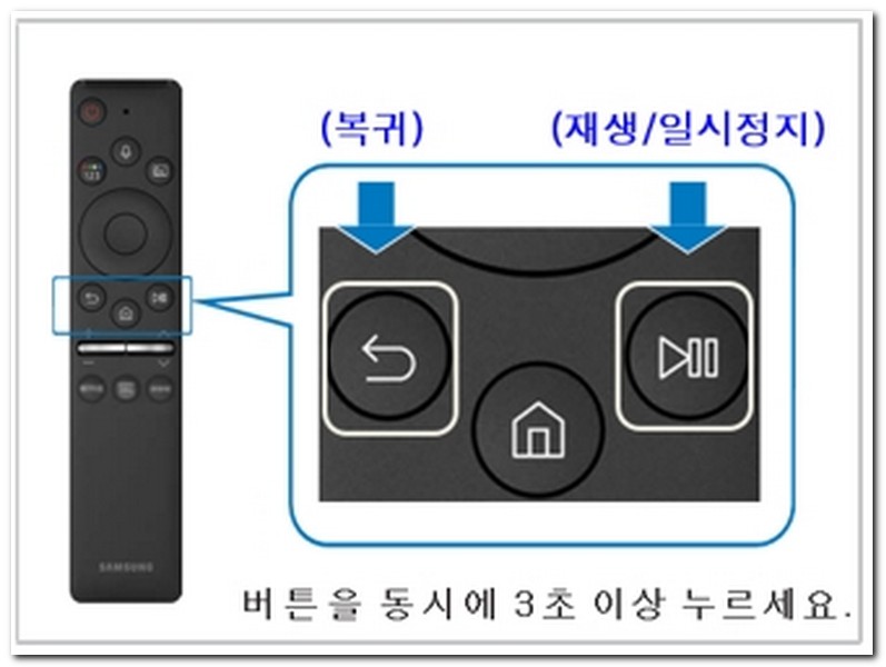 자동으로 연결되지 않는다면 삼성 스마트 TV리모컨을 TV방향으로 향하게 하고 복귀 버튼과 재생/일시정지 버튼을 동시에 3초이상 눌러준다.