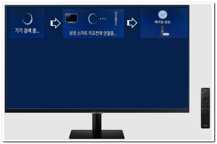 삼성 스마트 모니터를 구입하게 되면 함께 동봉되어 있는 리모컨과 자동으로 페어링(연결)되게 된다. 그러나 종종 이렇게 페어링 연결이 자동으로 안되고 멈춰있는 경우를 경험할 수 있다.