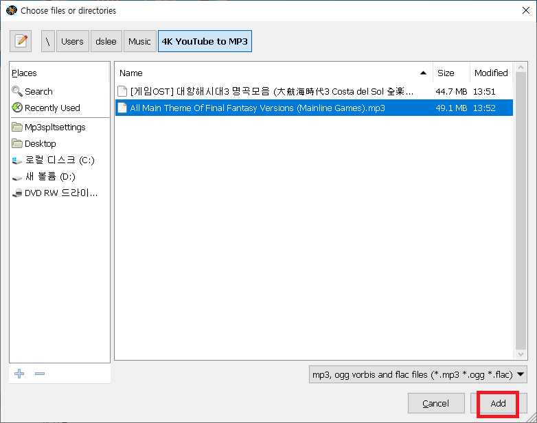 노래중에 트랙을 나누고 싶은 곡을 선택한다. Add를 선택해준다.