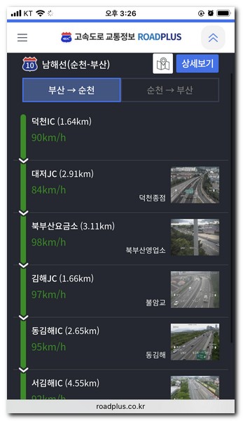 특히 주말이 되면 부산에서 순천방향의 남해고속도로 교통상황을 보게 되는데, 미리 정체가 되고 있는지 안되는지 실시간CCTV를 통해서 미리 확인해본다면 목적지까지 아무탈 없이 이동할 수 있을 것이다.