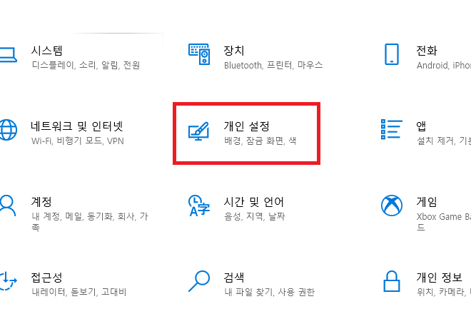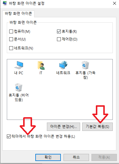 그리고 테마에서 바탕화면 아이콘 변경 허용을 선택해준다.