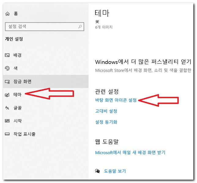 개인설정 -> 테마 -> 관련 설정 -> 바탕 화면 아이콘 설정 선택