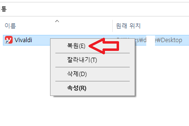 마우스 오른쪽 버튼을 눌러서 복원을 선택한다.